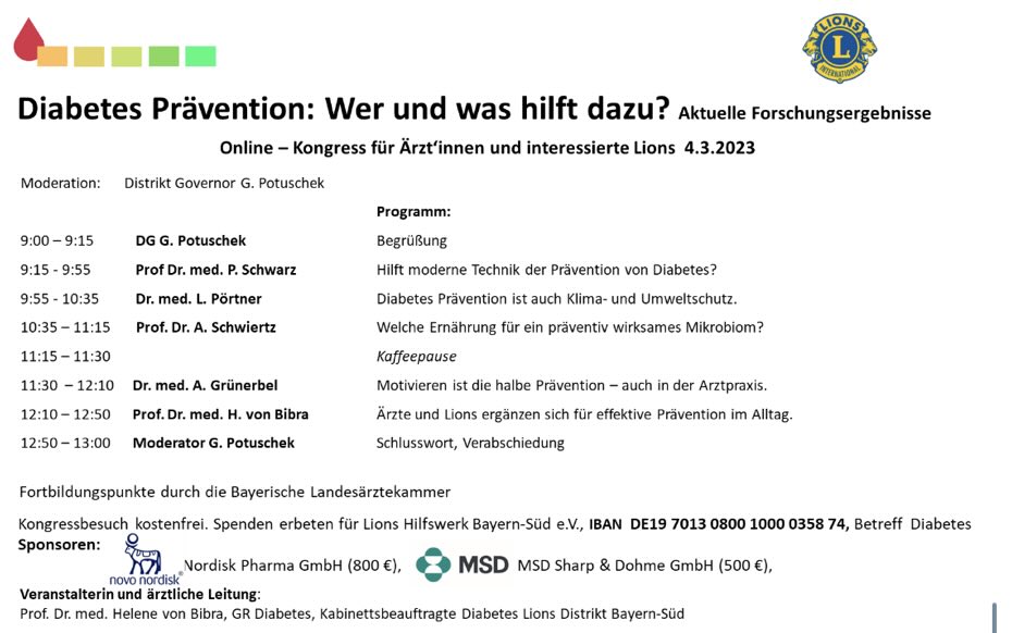 Bei Lions Deutschland wurde deshalb auf der Governorratssitzung im August 2017 ein Impulsvortrag zur neuen Zielsetzung Diabetes Prävention gehalten von Frau Prof. Dr. med. Helene von Bibra, dem langjährigen Mitglied des Lions-Club München-Pullach.
