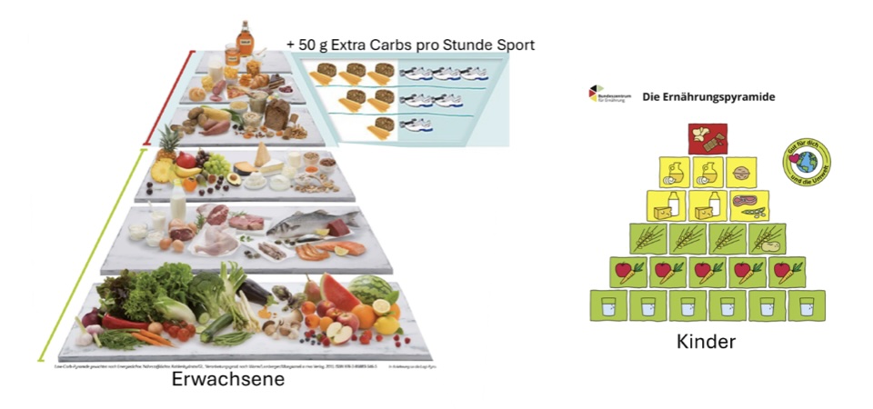 Daneben ist die Pyramide des Bundeszentrums für Ernährung (BZfE) vom September 2024 abgebildet, die besonders für (Schul-)Kinder geeignet ist und deshalb von Klasse 2000 verwendet wird.